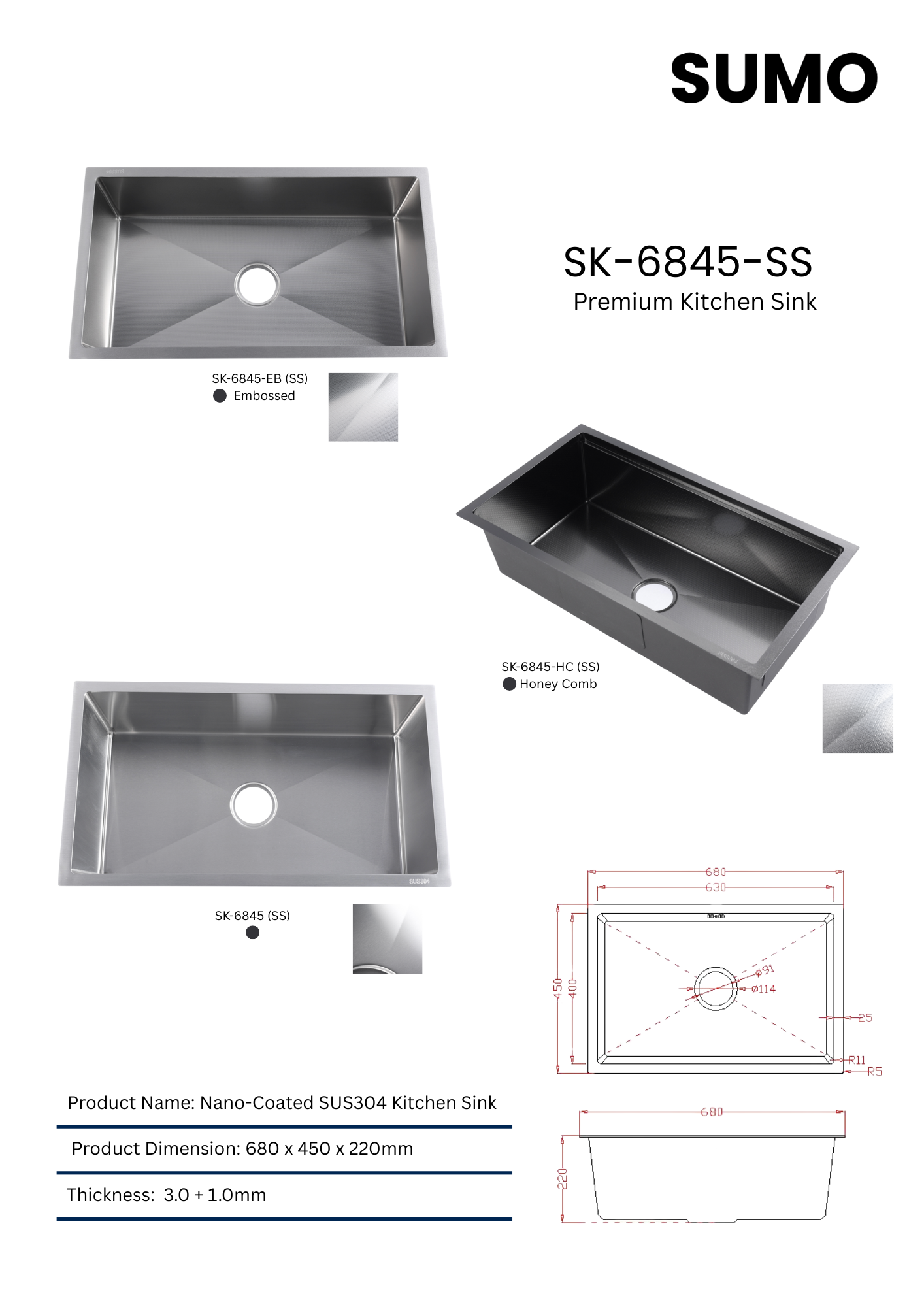 Premium HONEYCOMB Kitchen Sink (680mm x 450mm) – Stainless Steel